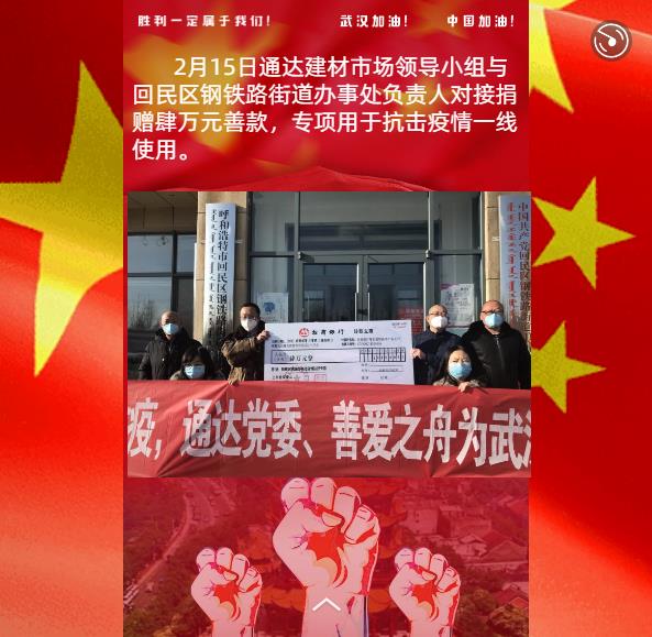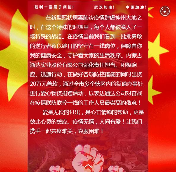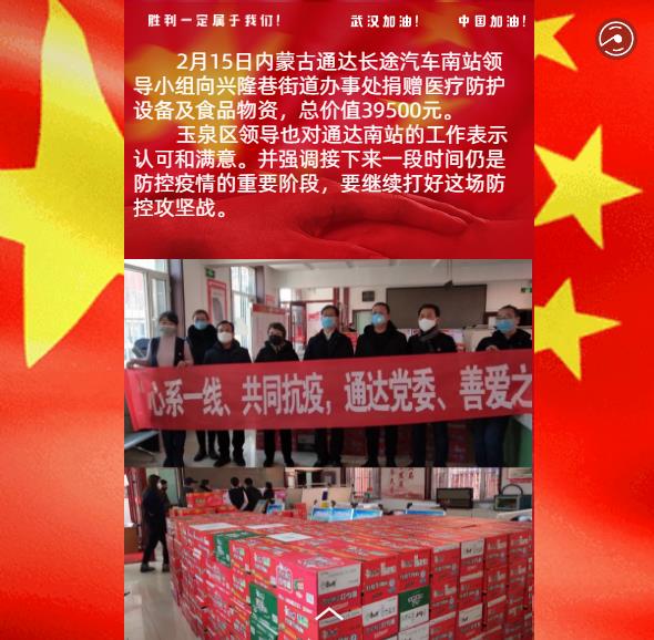 在新型冠狀病毒肺炎疫情肆虐神州大地之時(shí),在這個(gè)特殊的時(shí)期里,每個(gè)人都卷入了一場(chǎng)特殊的戰(zhàn)役。在疫情當(dāng)前我們看到一批批勇敢的逆行者夜以繼日的堅(jiān)守在一線崗位,保障著你我健康安全,守護(hù)者大家的生活秩序。內(nèi)蒙古通達(dá)實(shí)業(yè)股份有限公司強(qiáng)化責(zé)任擔(dān)當(dāng)、積極響應(yīng)、迅速行動(dòng),在做好各項(xiàng)防控措施的同時(shí)出資20萬元善款,通過全市多個(gè)轄區(qū)內(nèi)的街道辦事處進(jìn)行愛心物資捐贈(zèng)活動(dòng),以表達(dá)通達(dá)公司對(duì)奮戰(zhàn)在疫情聯(lián)防聯(lián)控一線的工作人員最崇高的敬意!