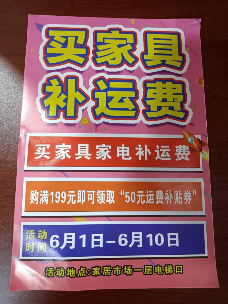 南站家居市場端午節(jié)促銷活動,從6日1日至10日,本著回饋消費者,提升商戶銷售量,烘托購物氣氛,買家具補(bǔ)運(yùn)費,來吸引消費者,家具市場從6月11日開始至13日,進(jìn)行補(bǔ)運(yùn)費領(lǐng)現(xiàn)金活動,商戶,消費者對本次促銷形式滿意,本次活動即增加了商戶銷售額,又提升了市場知名度。